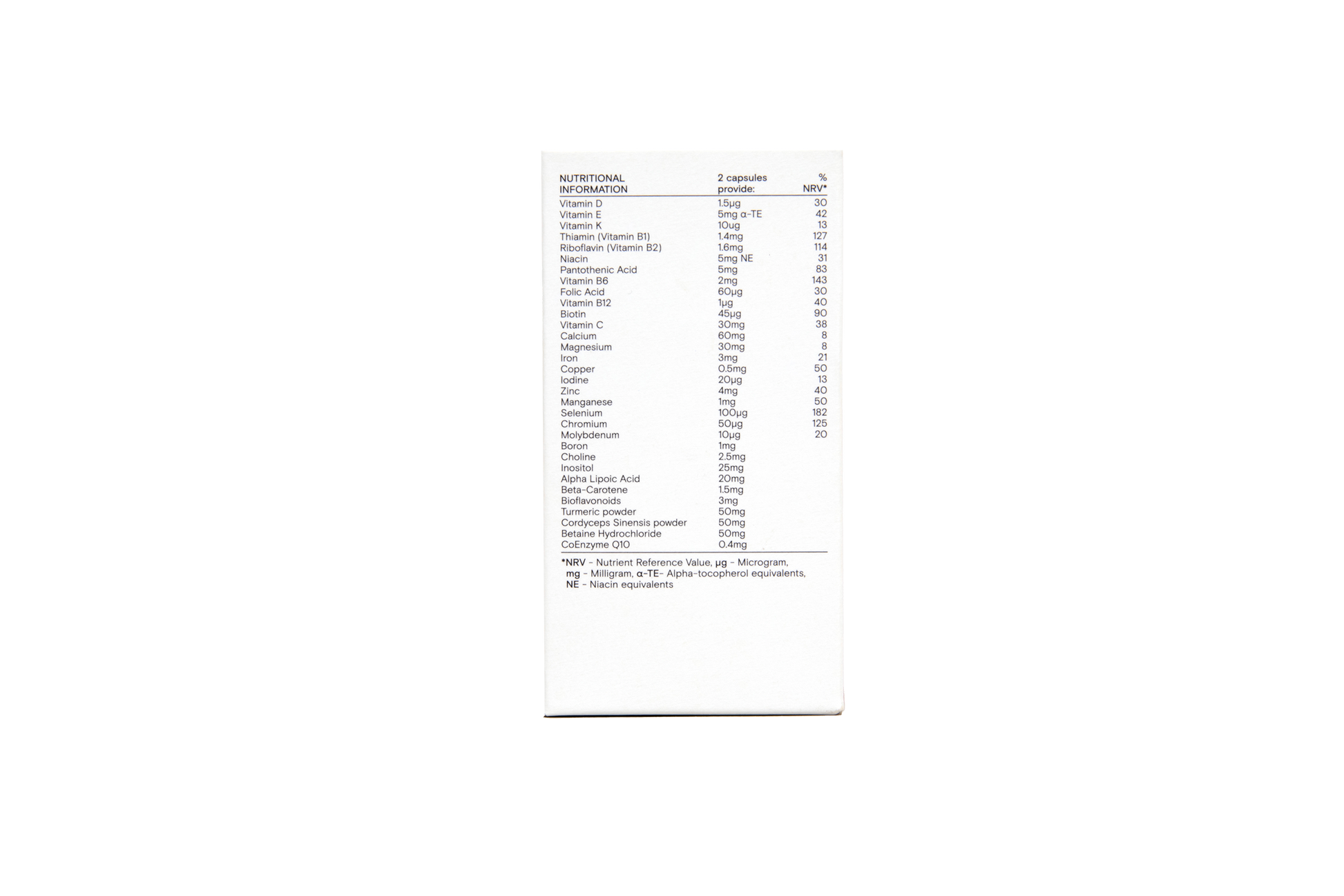 Ingredients:Lithothamnium Calcareum (Red algae) powder (providing Calcium), Nutrient-enhanced Yeast (providing Selenium, Inositol, Boron, Iron, GTF Chromium, Niacin, Manganese, Riboflavin, Vitamin B6, CoEnzyme Q10, Choline, Biotin, Folic acid [as naturally occuring Folate], Thiamin, Molybdenum, Iodine, Vitamin K1, Vitamin B12 and Vitamin D3), Purified Seawater (providing Magnesium), Nutrient-enhanced Lactobacillus Bulgaricus (providing Zinc, Copper and Pantothenic acid), Vegetable cellulose (capsule shell), Citrus pulp (providing Vitamin C and Bioflavonoids), Carrot concentrate (providing Beta-carotene), Betaine Hydrochloride, Turmeric powder, Cordyceps Sinensis powder, Nutrient-enhanced Yellow Pea (Pisum sativum) preparation (providing Vitamin E) and Alpha Lipoic acid. May contain heat-treated Brown Rice powder.