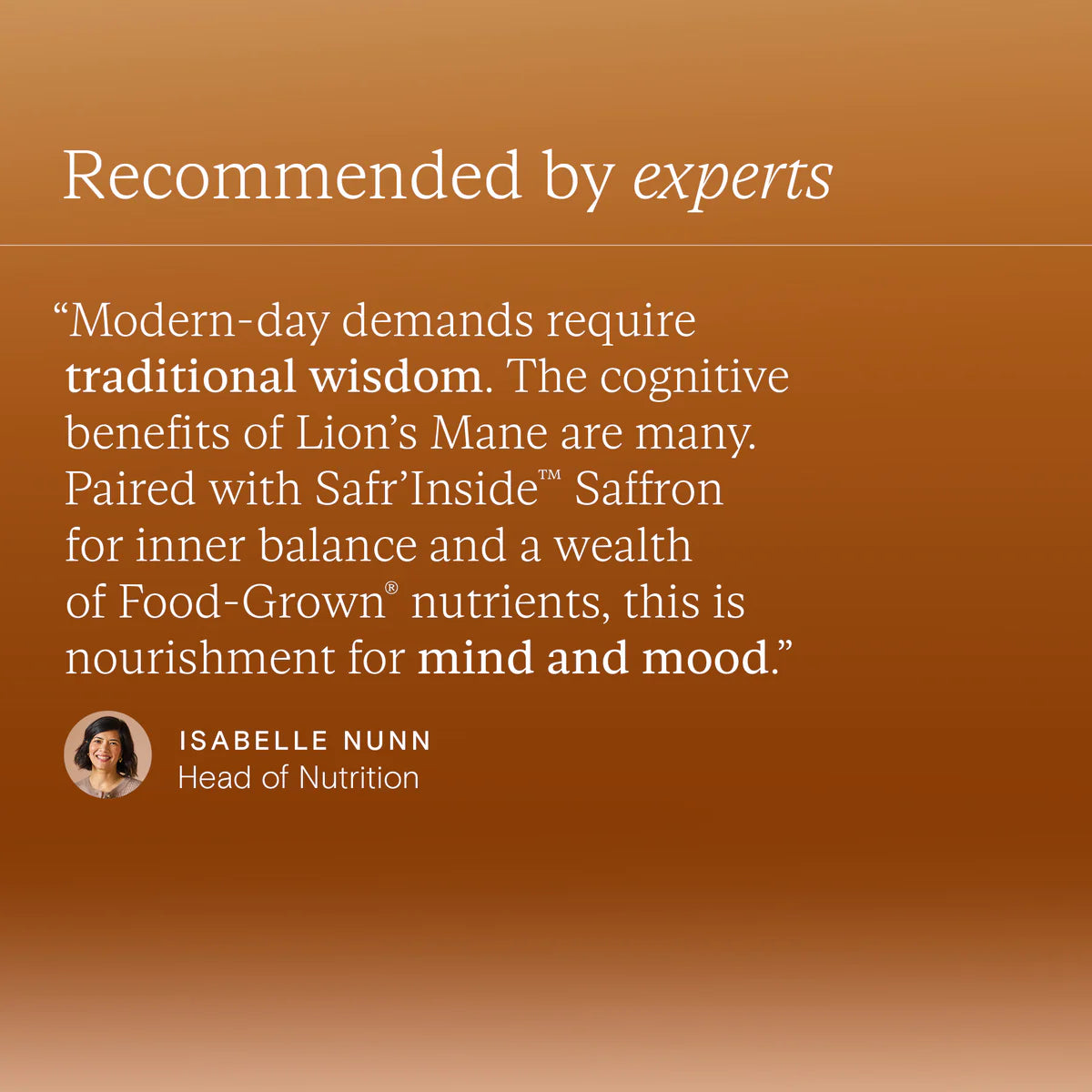 Modern life asks a lot of your mental reserves. That’s why we’ve combined a superior dual-extract Lion’s Mane with potent Safr’Inside™ Saffron, L-Theanine and a wealth of focus-fuelling, mind-centring nutrients. Because the stiller your mind, the clearer you think.