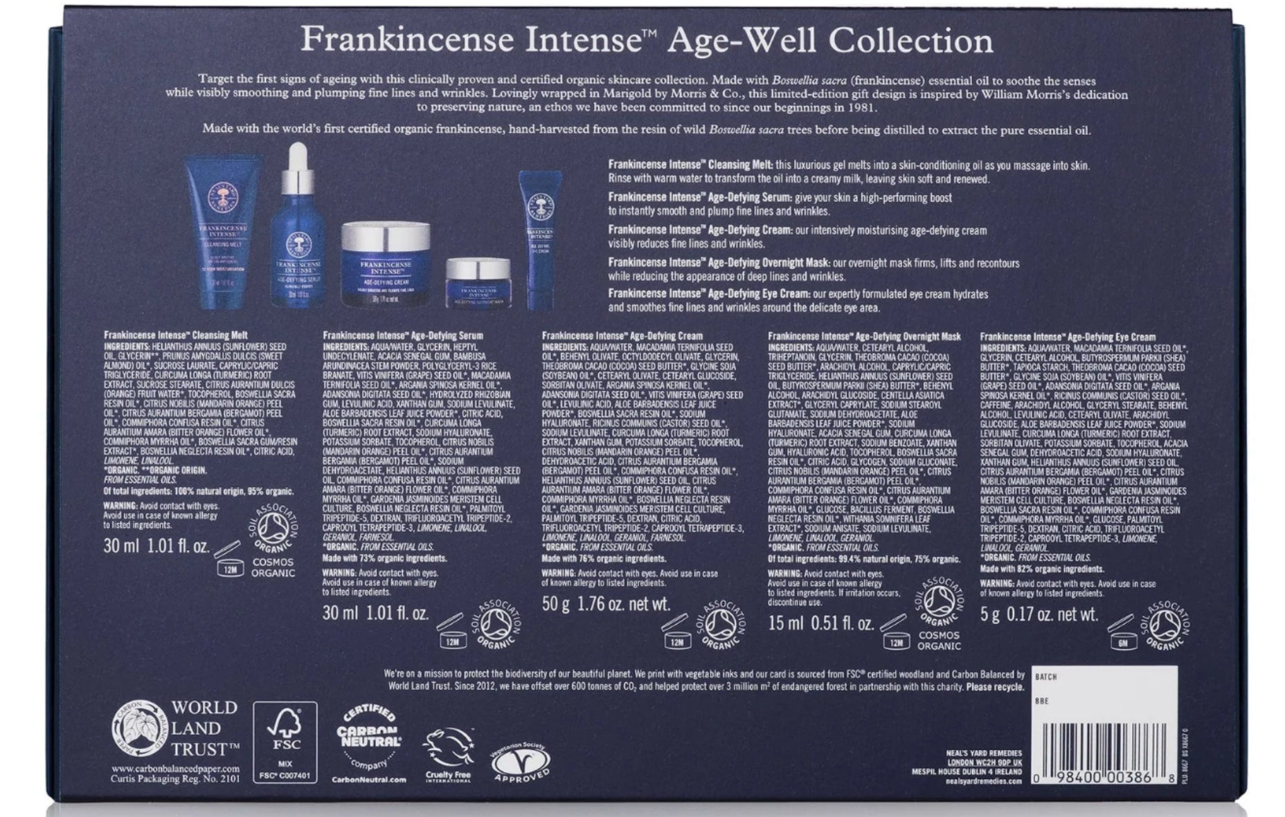 The gift of ageing well. This luxurious set of organic skincare is clinically proven to target the first signs of ageing: formulated to visibly smooth fine lines and wrinkles and made with frankincense essential oil to soothe the senses. Presented in William Morris’ marigold print, this limited-edition gift set reflects the designer’s dedication to preserving nature, a commitment Neal’s Yard Remedies has shared since our beginnings in 1981. Includes Frankincense Intense™ Cleansing Melt, Age-Defying Serum, Age-Defying Cream, Age-Defying Overnight Mask and Age-Defying Eye Cream.
