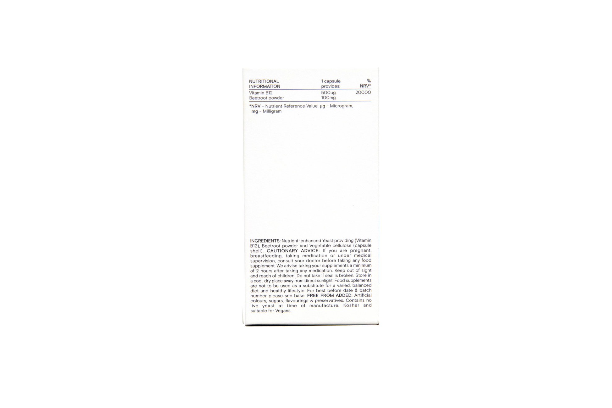 Nutrient-enhanced Yeast providing (Vitamin B12), Beetroot powder and Vegetable cellulose (capsule shell).